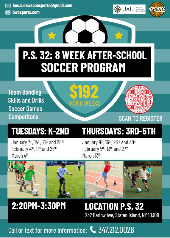 UAU and Because We Can Sports have teamed up with PS 32 to offer students a comprehensive 8 week soccer program beginning on